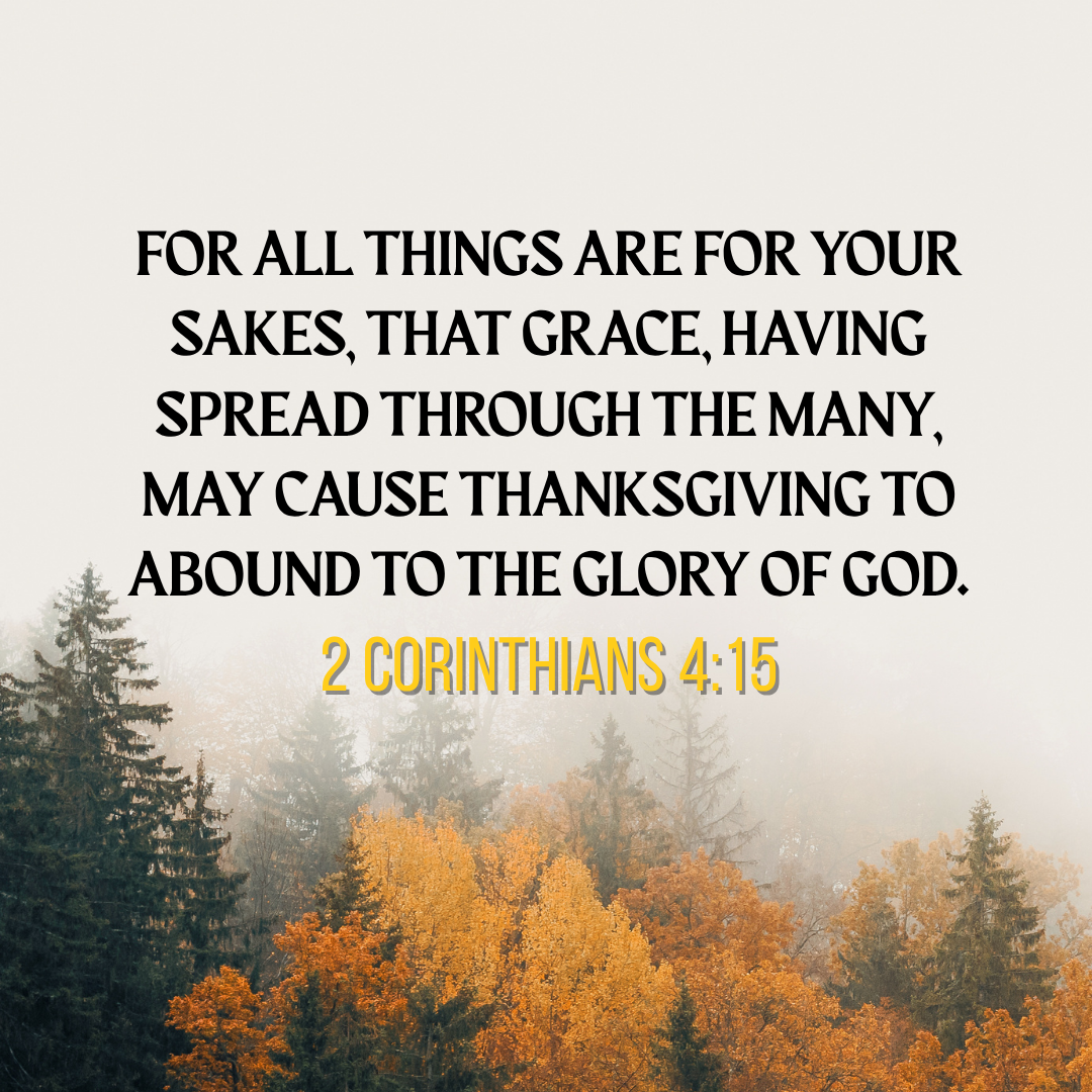 Scripture: “For all things are for your sakes, that grace, having spread through the many, may cause thanksgiving to abound to the glory of God.” – 2 Corinthians 4:15